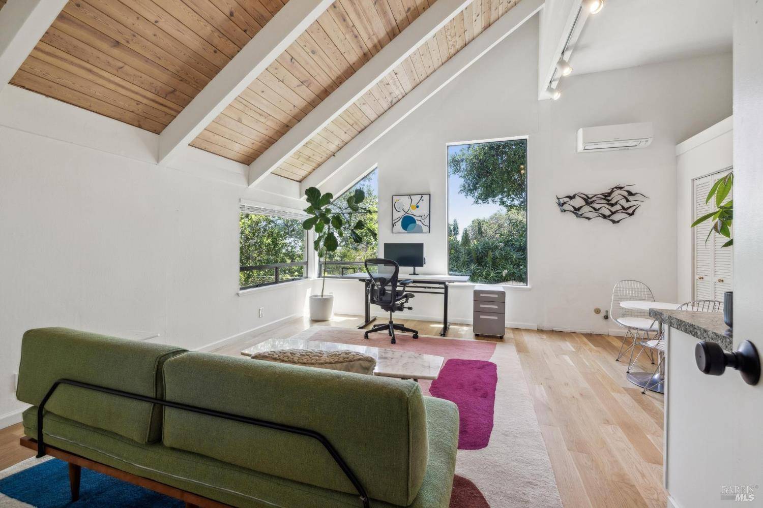 Perched above Fairfax with panoramic views of the five highest peaks in Marin,the Bay, and Mt. Diablo, this 3BD/3BA retreat blends architectural charm with everyday comfort. With 2,241 sq ft of living space, soaring ceilings fill the home with natural light, accentuating the home's elegant lines. The layout includes two spacious en-suite bedrooms and a flexible lower level with separate entry- ideal for guests, workspace, or income potential. The open kitchen connects seamlessly to a redwood deck and hot tub, while the spacious living and dining rooms show off the epic views through their oversized windows. Recent upgrades include new furnace/AC with both central air and mini-splits, kitchen appliances, W/D, electrical (street to outlet), cat 6 high-speed internet wiring and a generator. Mature landscaping in the fenced-in yard features flowers,cherries, berries, grapes, passion fruit, mandarin oranges and an avocado tree.The property backs up to Marin County open space and up the street you'll find a trailhead accessing a variety of outdoor activities including Camp Tamarancho's renowned trails. This welcoming neighborhood is known for its block parties and tight-knit, friendly vibe, all just minutes from downtown Fairfax's lively shops, cafes, and highly regarded schools.