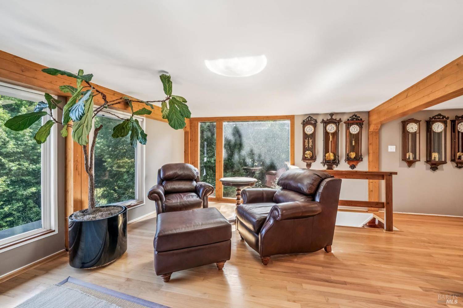 Welcome to 40 Mountain Lane a handcrafted sanctuary nestled on the slopes of Mt. Tamalpais. This magical Mill Valley oasis blends custom artistry with nature, featuring redwood ceilings, rich woodwork, and architectural staircases that flow through the home. The living and dining areas are framed by floor-to-ceiling windows overlooking a lush, park-like setting with multiple Ipe decks and a mature lemon tree. The chef's kitchen showcases custom cabinetry, granite counters, and Viking Professional appliances, while cozy gathering spaces with a gas fireplace and Brazilian cherry floors invite warmth and connection. The primary suite offers tranquil views of the forest canopy, the San Francisco skyline, and the East Bay hills, while an expansive lower deck with a hot tub, sauna, and outdoor shower creates a true state-park-like retreat. Thoughtful upgrades include solar power with large capacity battery backup, a high-efficiency heat pump with AC, a new metal roof, and an oversized garage with EV charging. Just minutes to downtown Mill Valley and the Golden Gate Bridge, 40 Mountain Lane captures the perfect balance of craftsmanship, comfort, and natural beauty.