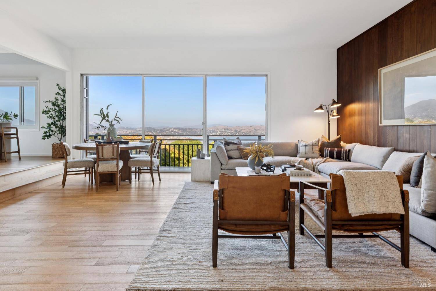 Mid-Century Modern Sanctuary with Wabi-Sabi Soul, Plus Sweeping Bay and Mt. Tam Views! Experience serenity and sophistication in this timeless mid-century home perched above Sausalito's tranquil hillsides with sweeping views of the Richardson Bay/Marina/Pt. Strawberry/Tiburon and Mt. Tamalpais. The property blends organic materials and a soothing Wabi-Sabi vibe; celebrating simplicity, texture, and natural beauty, set on a private ~.22-acre lot. Mostly one-level living features a remodeled open kitchen flowing into a sunken living room with gas fireplace, view deck, and sliding glass doors framing stunning vistas. The primary suite includes a private sauna; the second bedroom offers an attached office ideal for remote work or creative pursuits. Japanese-inspired gardens and a secluded patio invite outdoor entertaining or quiet relaxation. A lower-level den (or optional third bedroom) connects to an attached two-car garage, completing this thoughtfully designed retreat. Just 3 minutes to the Golden Gate Bridge for a dream commute. Enjoy easy access to Caledonia Street's local favorites: Driver's Market, Sushi Ran, Equator Coffee, Salt Boutique, Dunphy Park, and live music at the legendary Sausalito Cruising Club... offering the best of Marin coastal lifestyle~